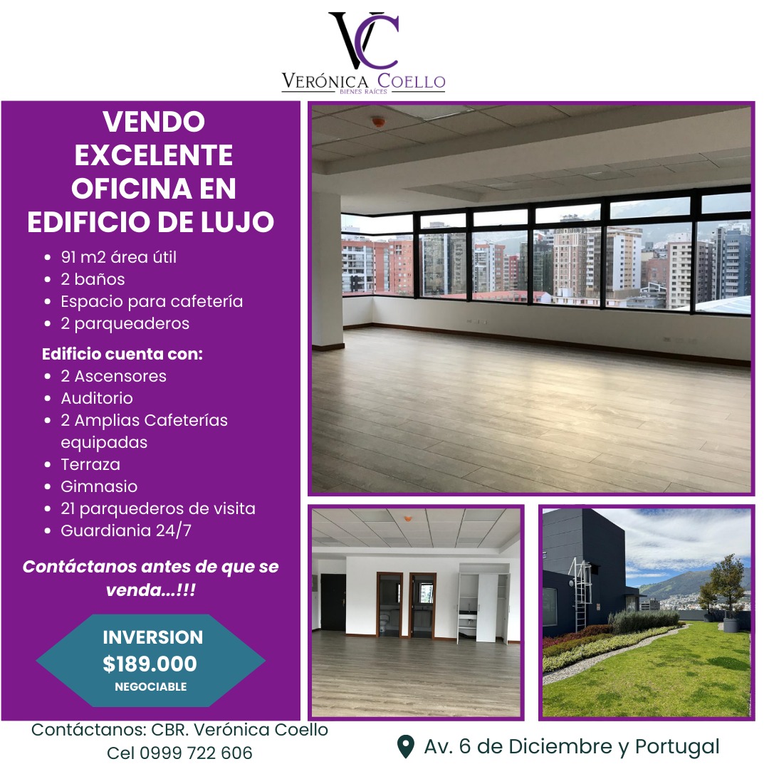 ubicada en edificio de lujo, 6 de diciembre y Portugal con 4 ascensores, área de recepción y sala de espera, áreas comunales, terraza con Bbq, auditorio, 2 cafeterías, generador eléctrico, 21 parqueaderos de visita.