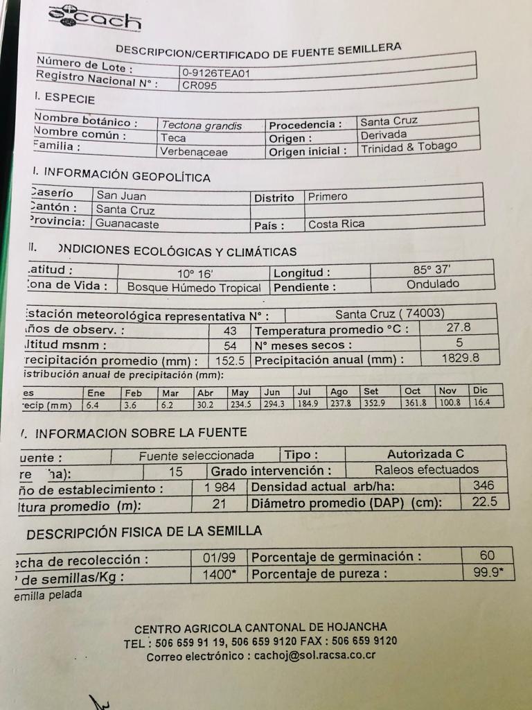 Nuestra Teca, está garantizada con el uso de las mejores semillas de Costa Rica. Disponemos de certificados de la fuente semillero, lo que garantiza nuestros sembríos