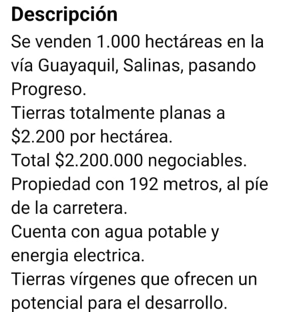 Se venden 1.000 hectáreas al pie de la carretera en la vía Guayaquil, Salinas, pasando Progreso.