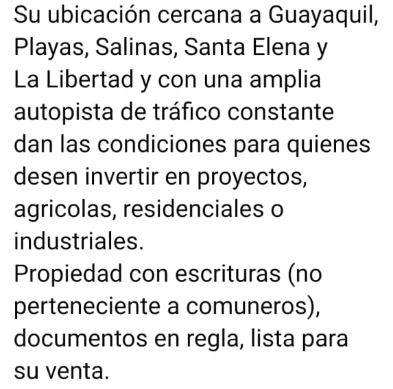 Su ubicación cercana a Guayaquil, Playas, Salinas, Santa Elena y La Libertad y con una amplia autopista de tráfico constante dan las condiciones para quienes desen invertir en proyectos, agricolas, residenciales o industriales.